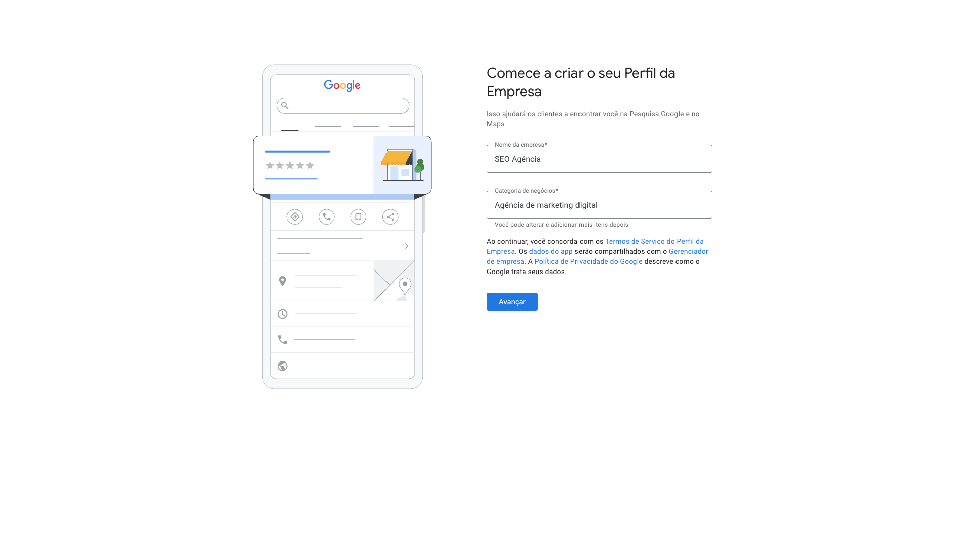 Nome da empresa: coloque o nome da sua empresa – é assim que ela vai aparecer no Google.