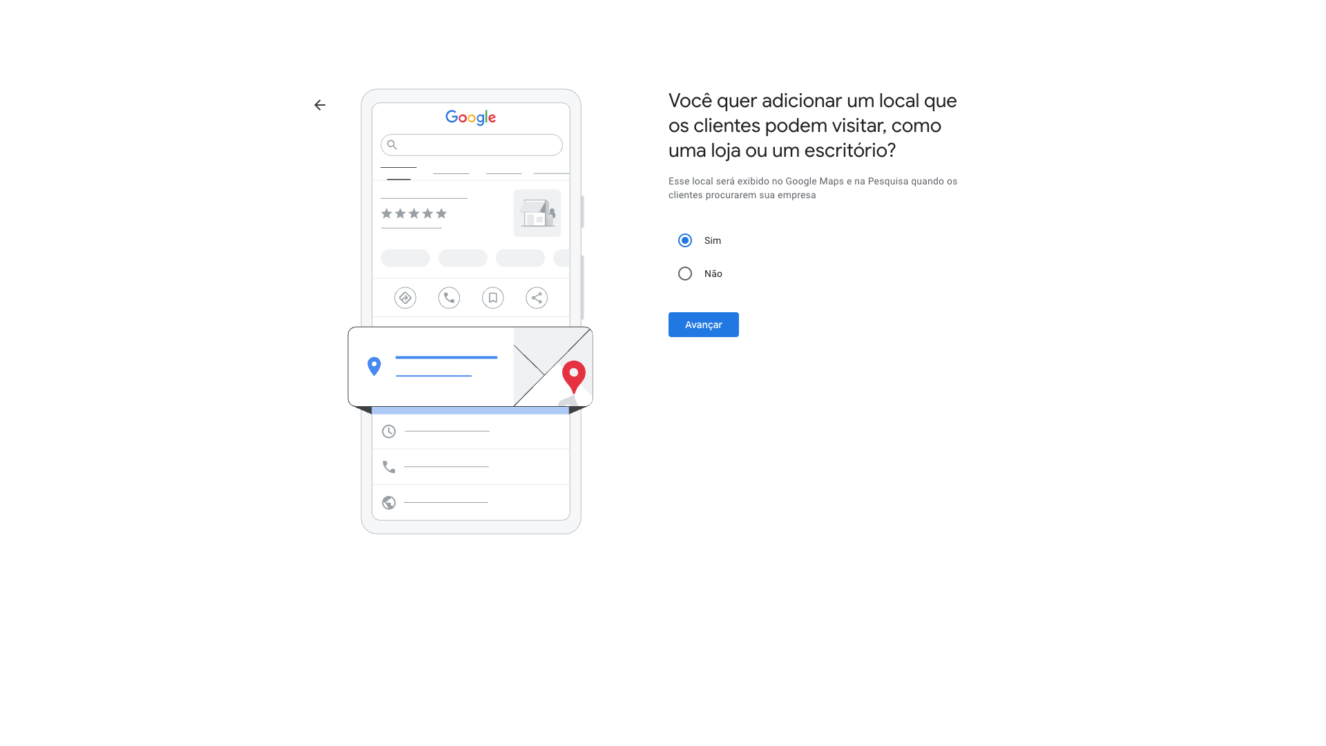 Nesta próxima etapa será solicitado se você tem um local físico para receber clientes. No nosso caso, há. Por este motivo selecionaremos sim. Mas se você não tiver, basta selecionar não e clicar em AVANÇAR.