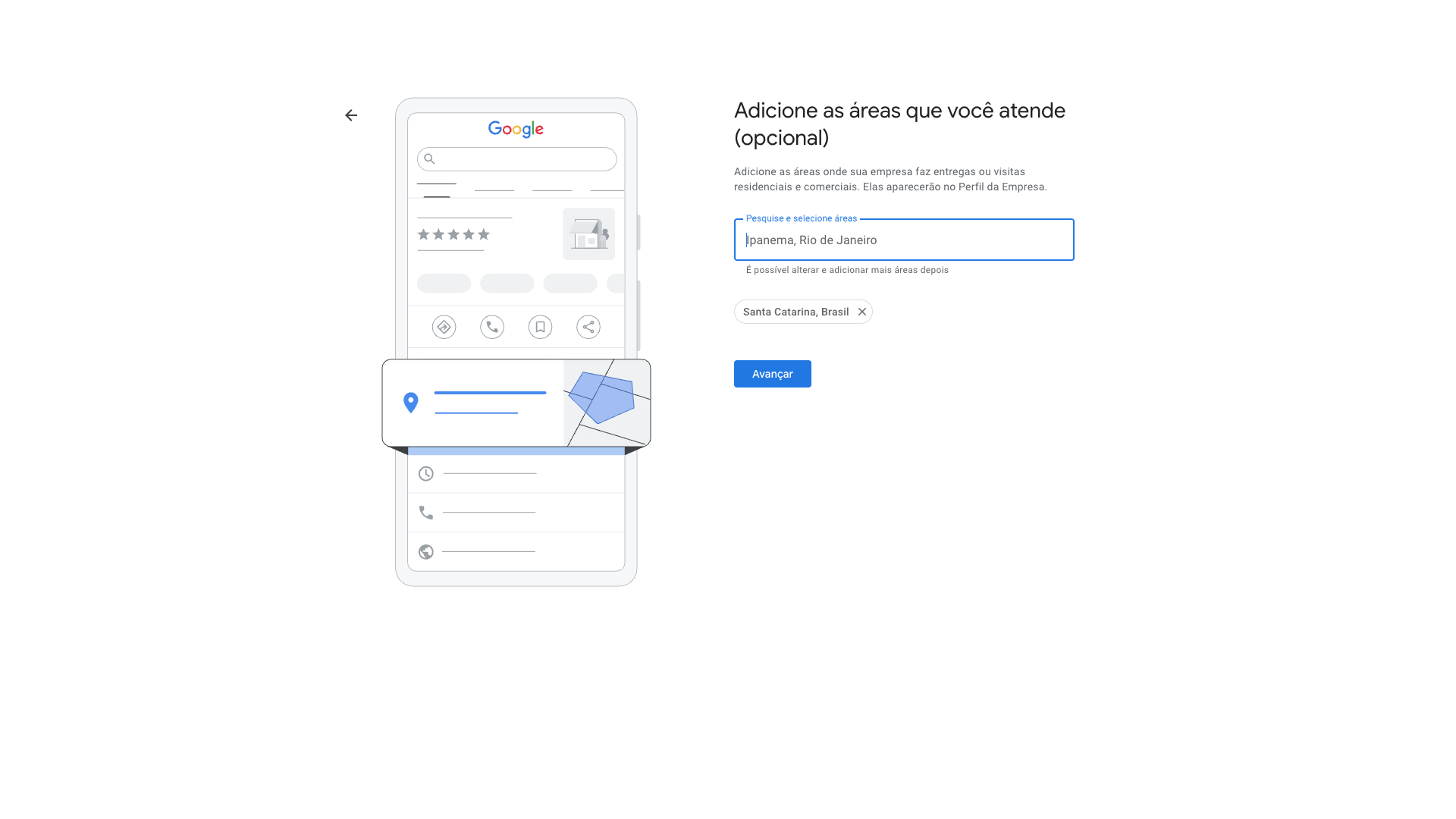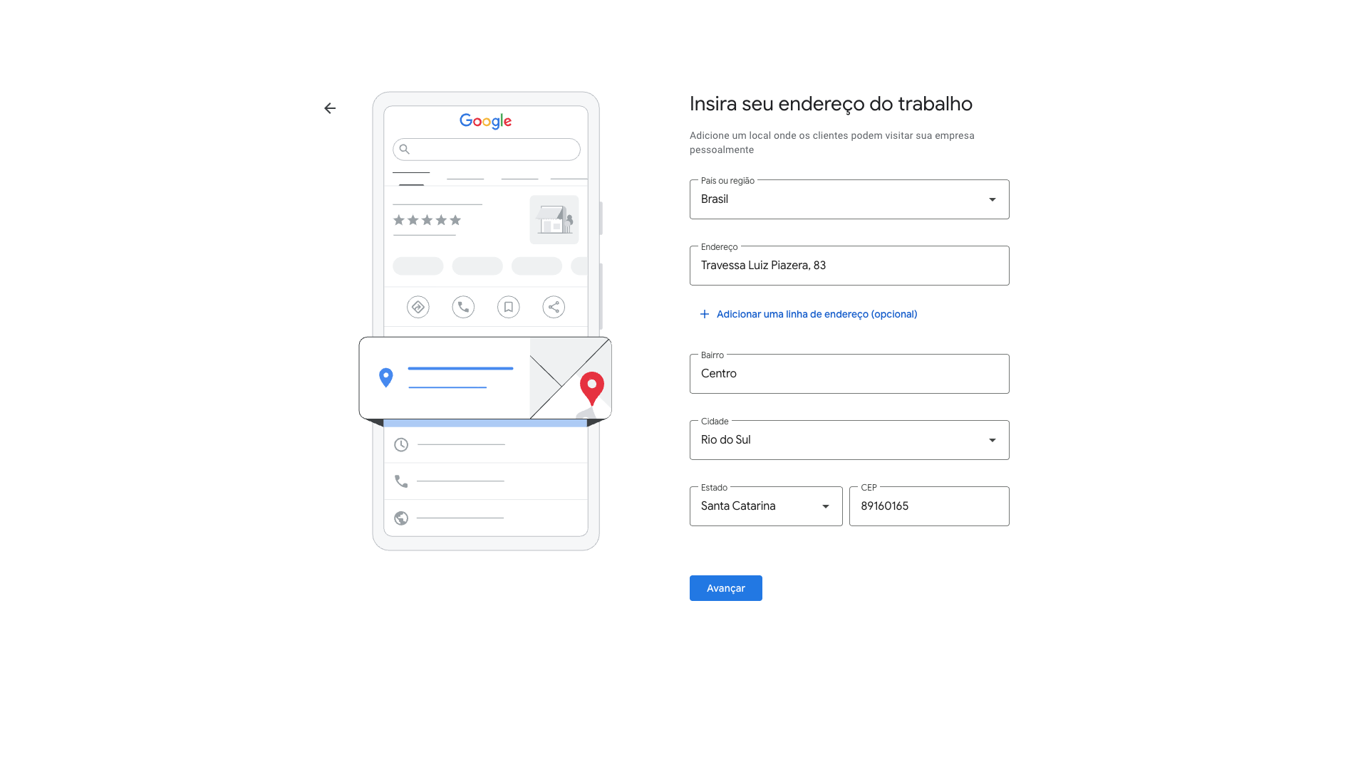 Aqui preenchemos exatamente o local de onde o escritório ou estabelecimento local fica. É importante realmente existir, pois muitas vezes o próprio Google envia uma carta para o local com um código no intuito de validá-lo. Se você mentir aqui, todo o processo não dará certo.