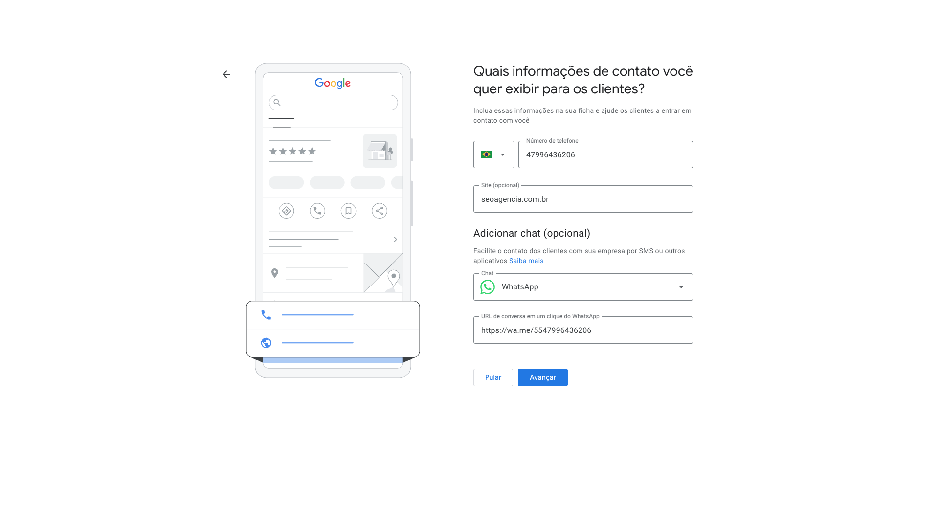 Agora, quais dados de contato estarão disponíveis para o usuário que encontrar sua empresa no Google. Estes serão os meios de comunicação estabelecidos.