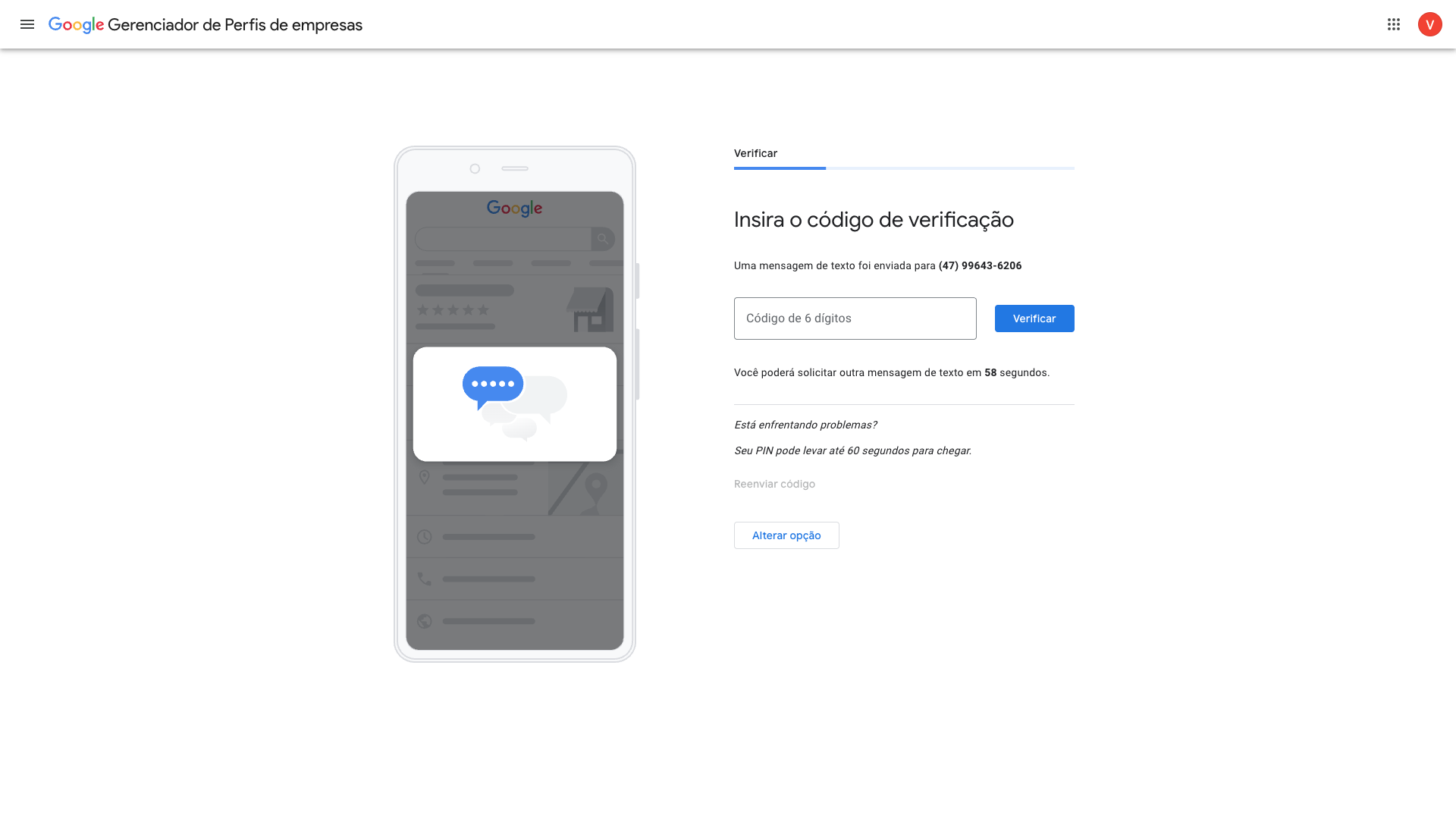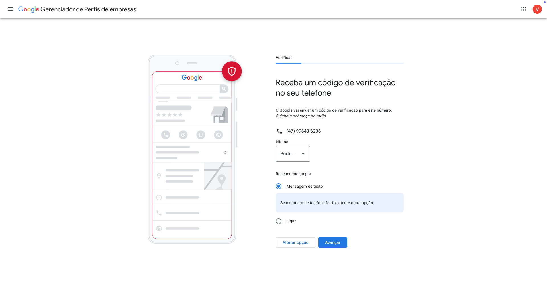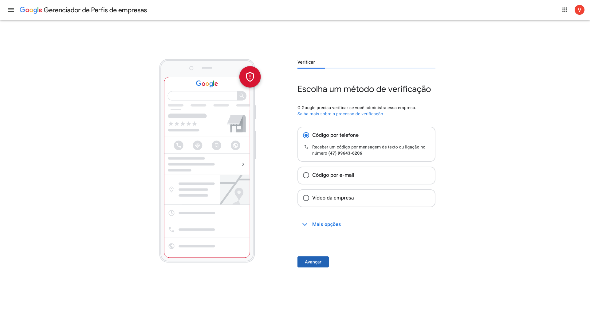 O número cadastrado na etapa anterior será utilizado como um dos métodos disponíveis para verificar sua conta. Selecionamos ele por ser a opção mais prática.
