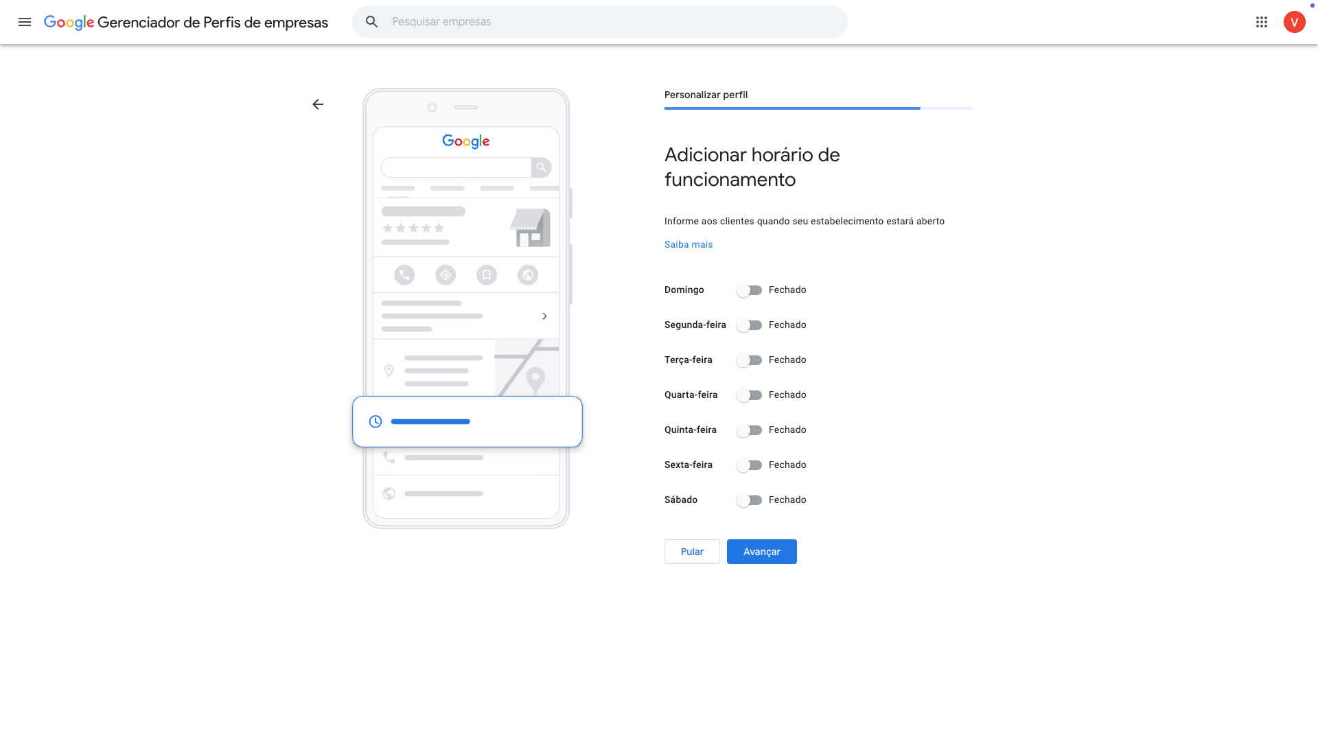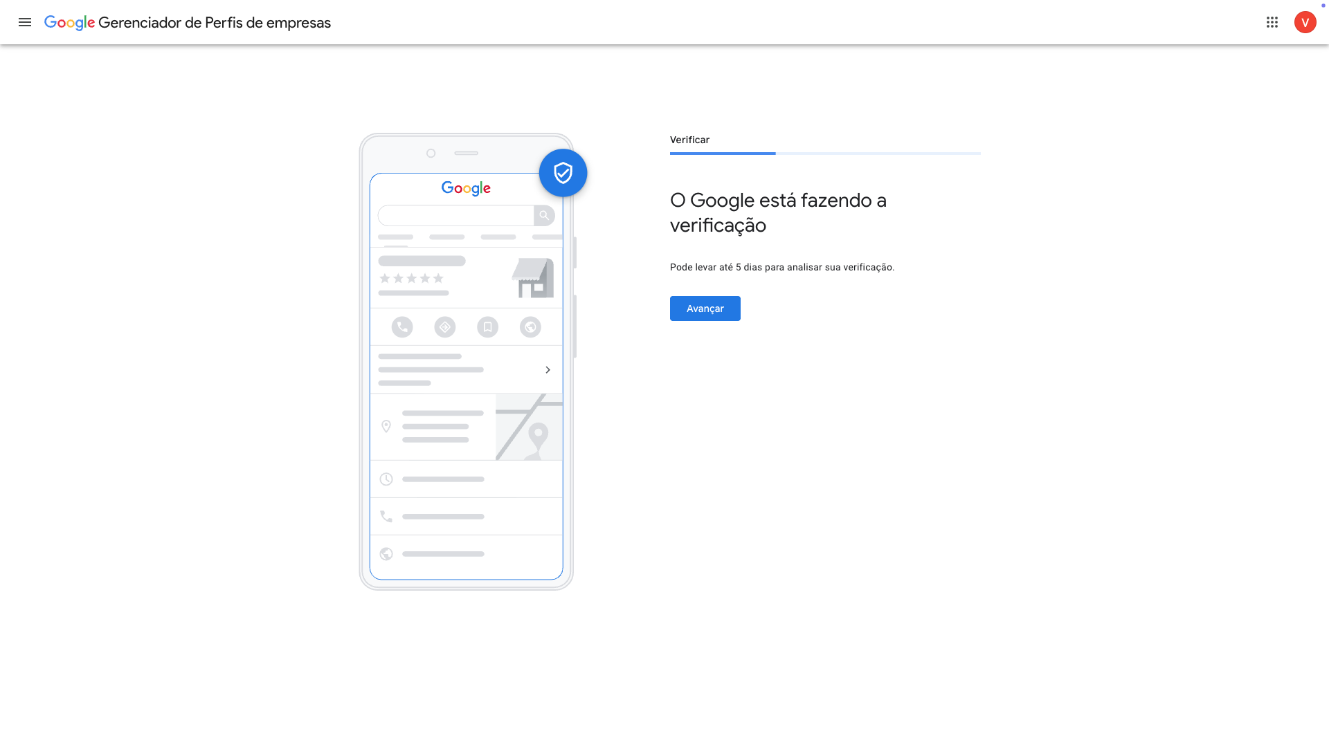 Nesta tela o Google indica que a verificação está em andamento. Nesta página não há nada mais a ser feito se não clicar em AVANÇAR e continuar o preenchimento dos próximos dados.