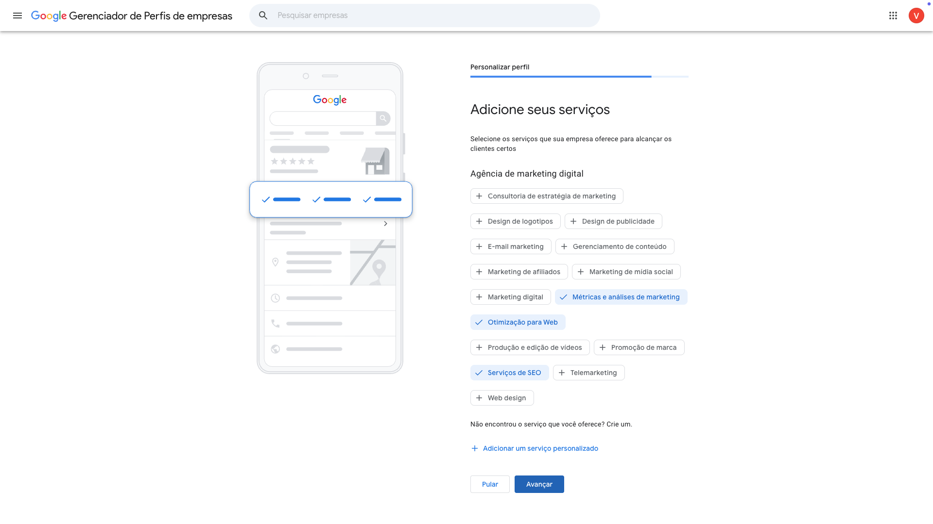 Nesta etapa será complementado o cadastro. Vamos selecionar os serviços que prestamos. Muitas vezes não será preciso, mas selecione o que melhor corresponder ou abranger aquilo que você faz.