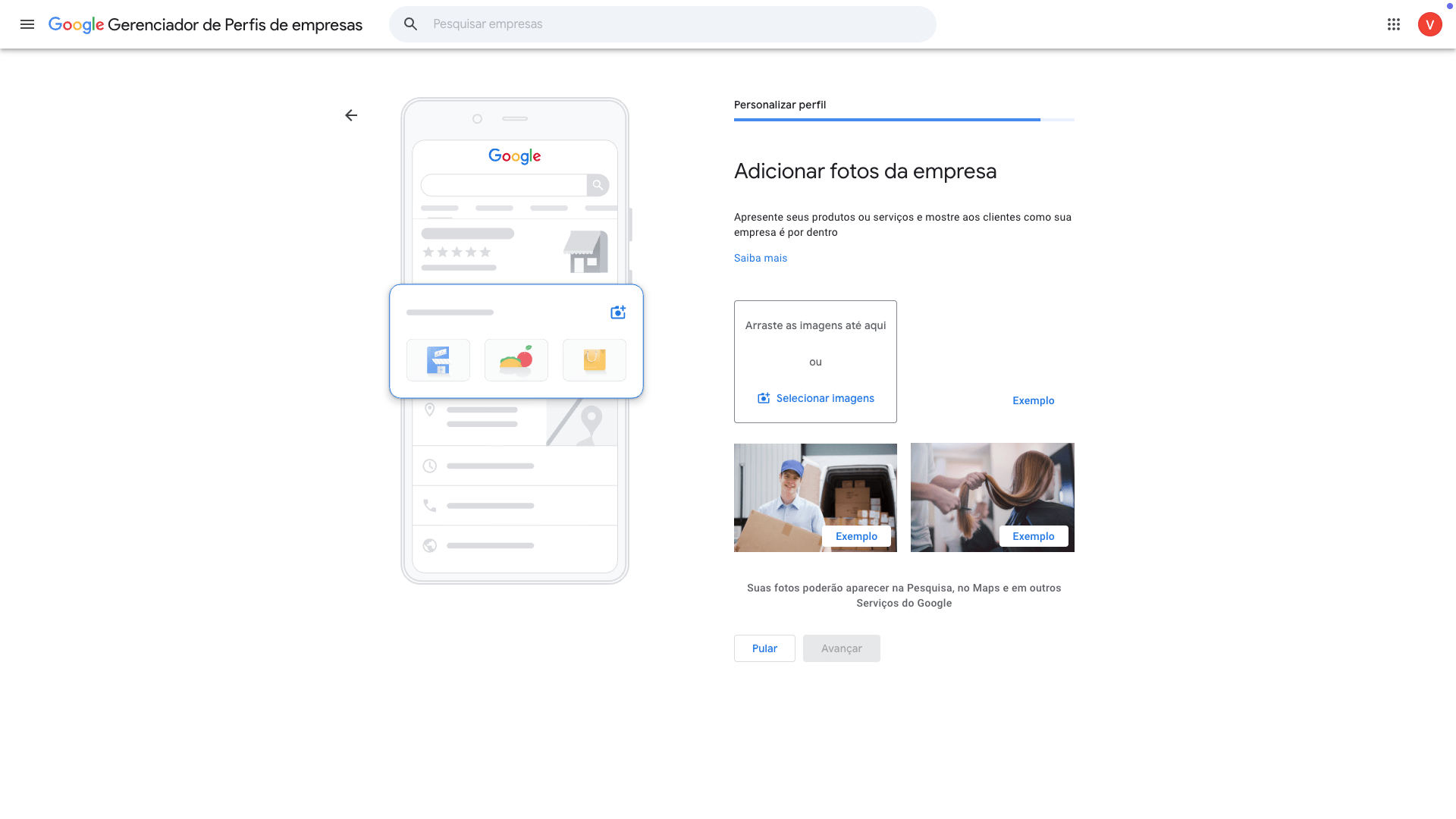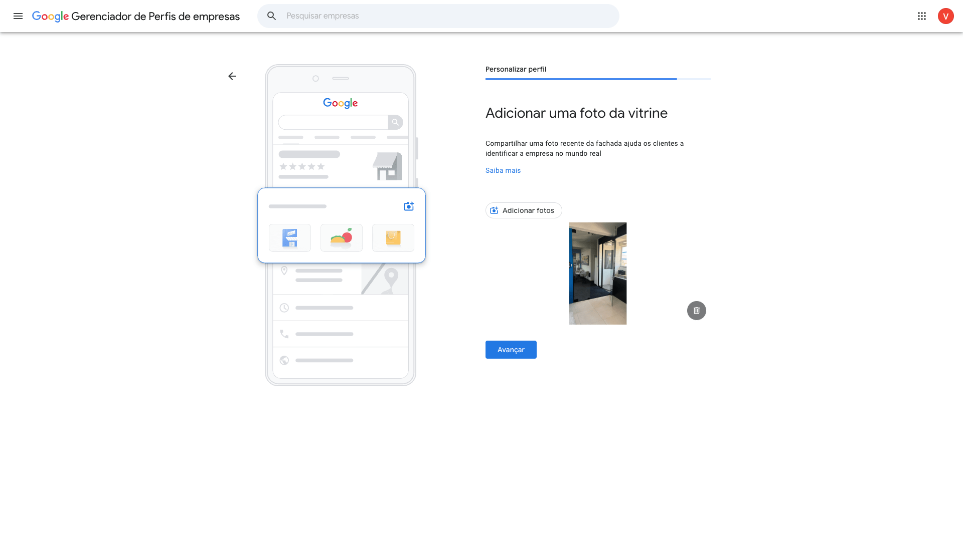 Agora é hora de acrescentar fotos que mostrem a fachada e a vitrine da sua loja ou estabelecimento. Se não houver nada do tipo, o hall de entrada já bastará para esta primeira etapa.