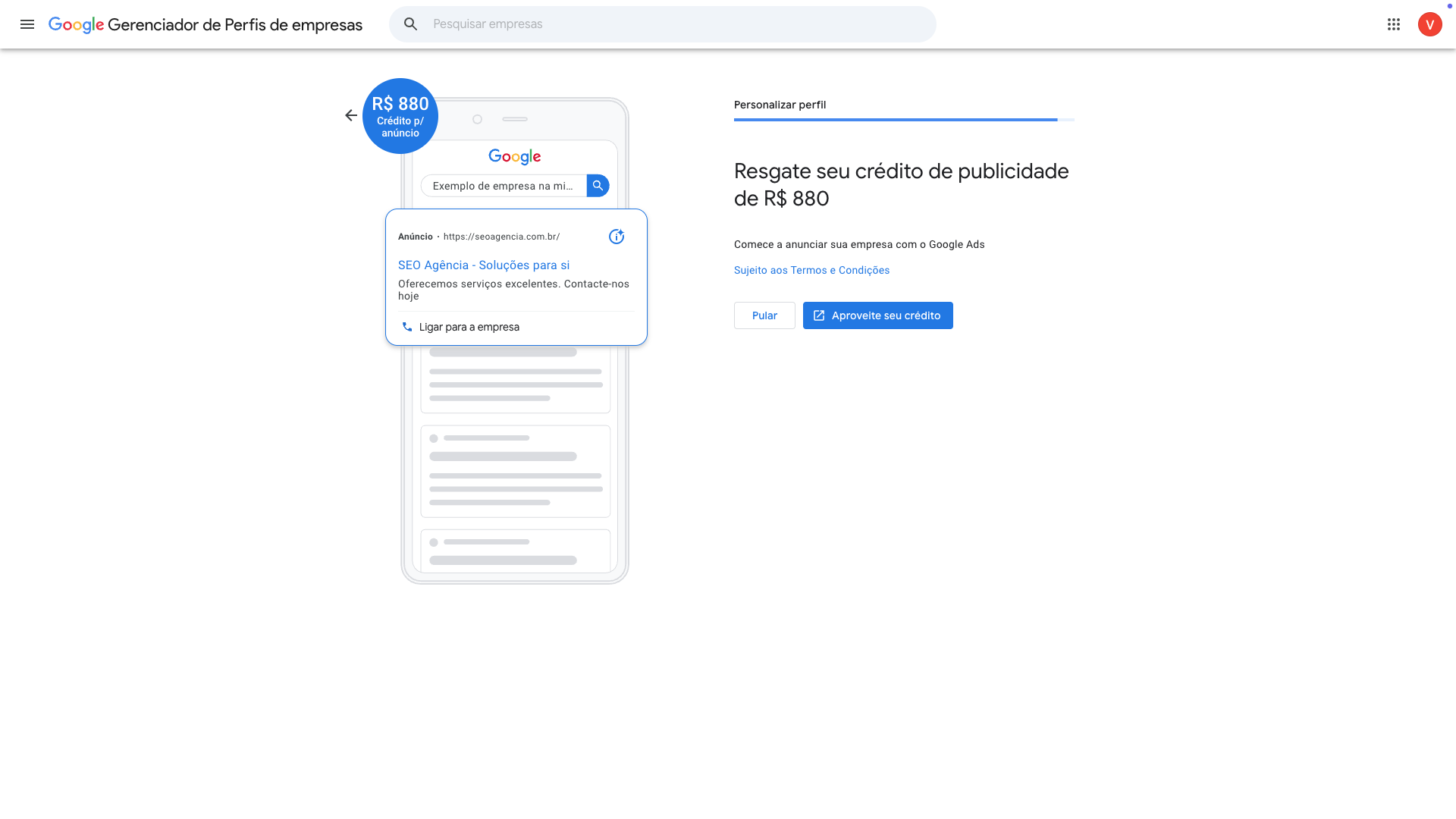 Aqui não é obrigatório também. Mas caso você vá iniciar a veiculação de campanhas de marketing no Google Ads, eles oferecem um ‘gatilho’ para que de fato o faça ao disponibilizar 880 reais de crédito para suas campanhas.
