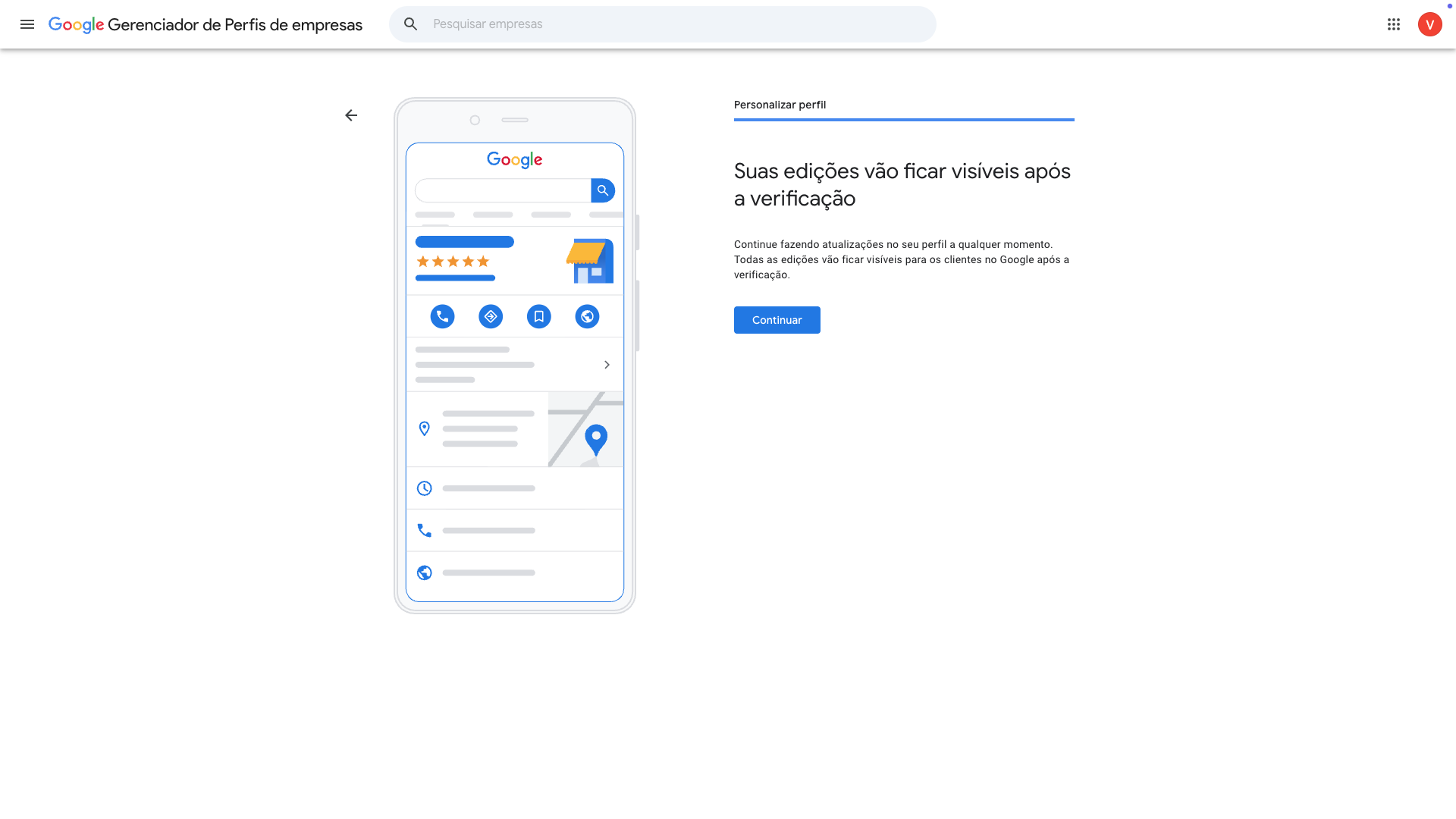 Essa é a tela de conclusão do cadastro, basicamente. Ela indica que as informações e seu perfil estão sendo submetidos a verificação e que até que isto ocorra elas não estarão disponíveis nas consultas do Google. É necessário aguardar.