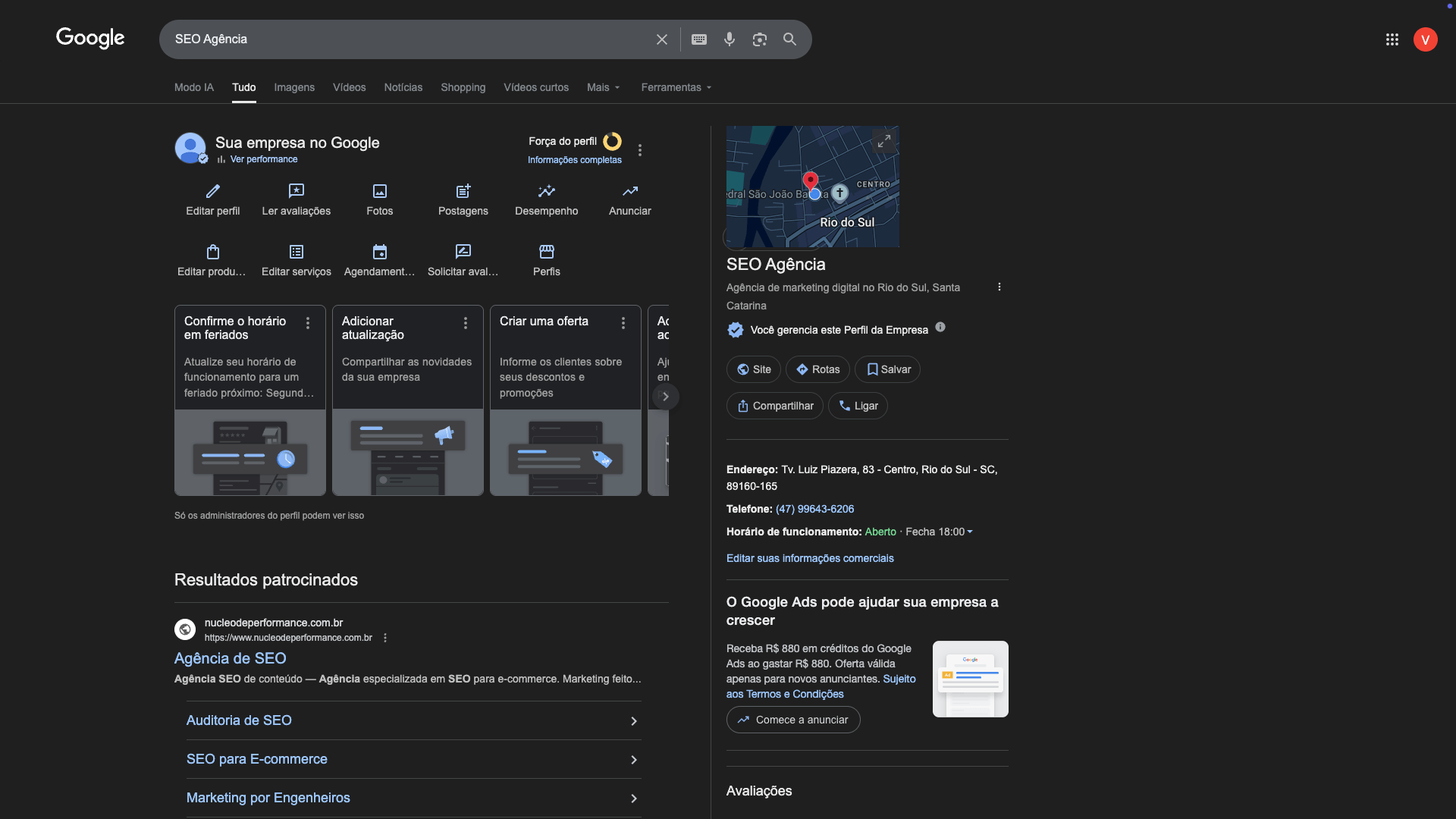 Ao clicar em continuar você será transferido para uma tela de busca do Google, mostrando sua empresa, os dados cadastrados à direita, além de outras opções administrativas para você editar, ler avaliações e até mesmo visualizar métricas a respeito da sua performance nas pesquisas.