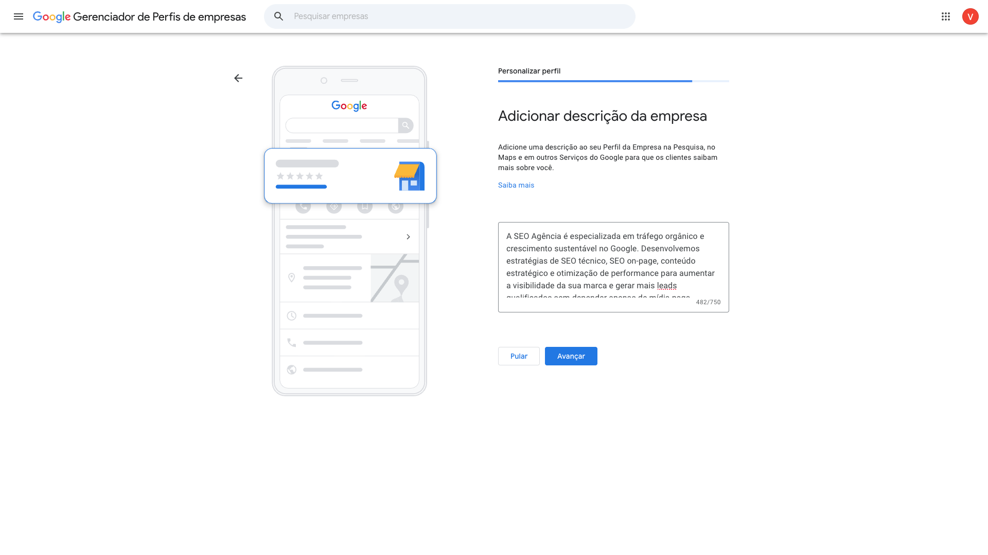 Momento de adicionar uma descrição da sua empresa. Como o campo é limitado em 750 caracteres você precisa ser objetivo na informação. Aqui é hora de otimizar o que você vai por, usar boas palavras-chaves que se relacionem ao seu negócio para que isso ajude a evidenciar mais sua marca nas procuras.